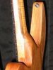 No, you don't eat it... Butternut is the kind of wood, actually the kind of tree. A member of the same genius of trees as Walnut, except the wood is lighter in colour, and is vary light in weight, closed grained, nice tap tone, and one hell of a beautiful look. Matching this vary unusual guitar body wood up with a Flamed Soft Maple and Walnut laminated neck (lighter in weight) makes for a vary light and well balanced instrument. The neck joint is a cross of the Fender and Gibson styles. Start with a fender style bolt-on neck joint but with a vary tight fit, then glue it in place, and carve the heel to make it feel and play like a through-neck guitar. You can actually feel the notes played in your left hand as you hold the neck, and the body resonates against your body like an acoustic. Who says light guitars don't sustain... you got to check this guitar out. Now to get all that tone down to the amp, I've used a set of deMarzio strat style vertical stacked Alnico 2 humbuckers for a warm clean tone and none of that 60 cycle hum. Click on these photos to see a larger image.
